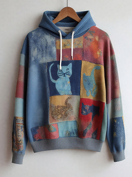 Women's Artistic Cat Print Casual Pocket Hoodie - Blue