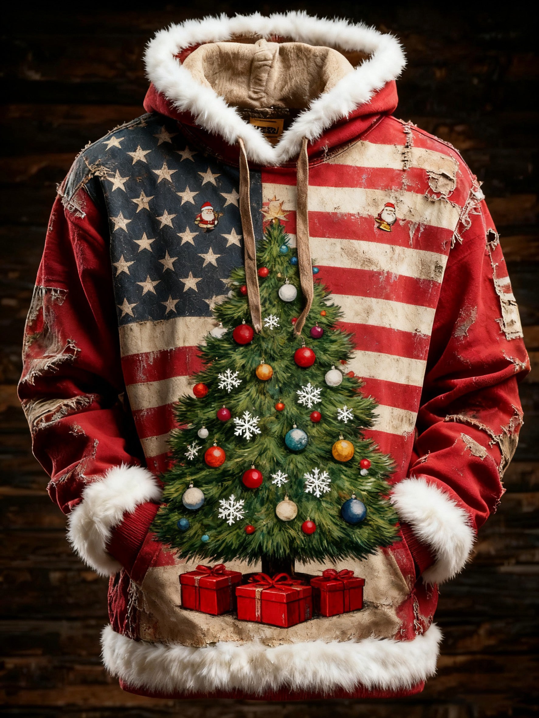 Men's Retro American Flag Christmas Tree Printed Hoodie