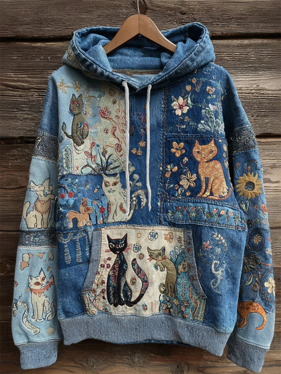 Women's Artistic Cat Print Casual Pocket Hoodie