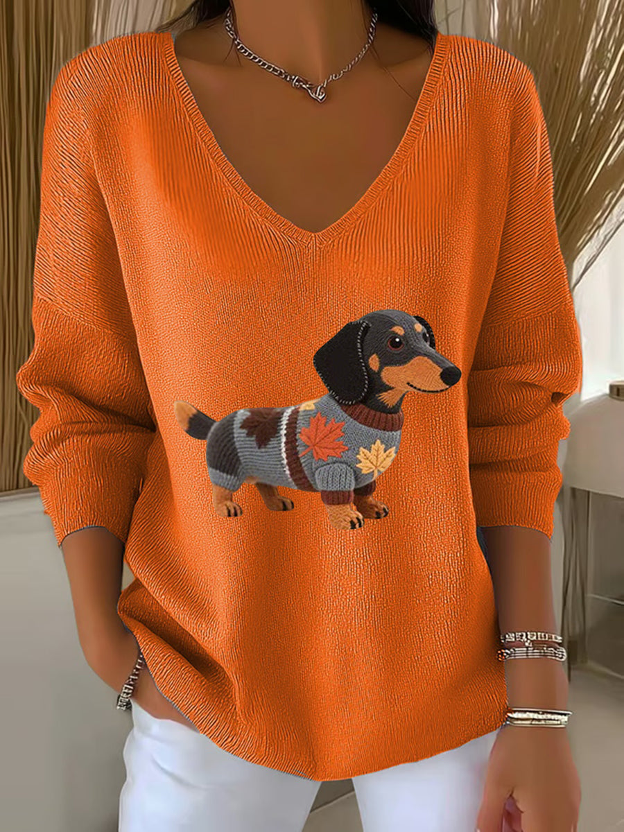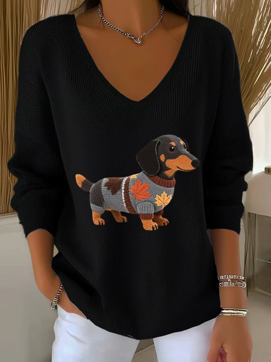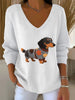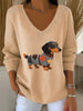 Women's Autumn Dog Art Print V-Neck Ribbed Top