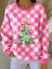 Women's Christmas Tree Plaid Ribbed Round-Neck Sweatshirt
