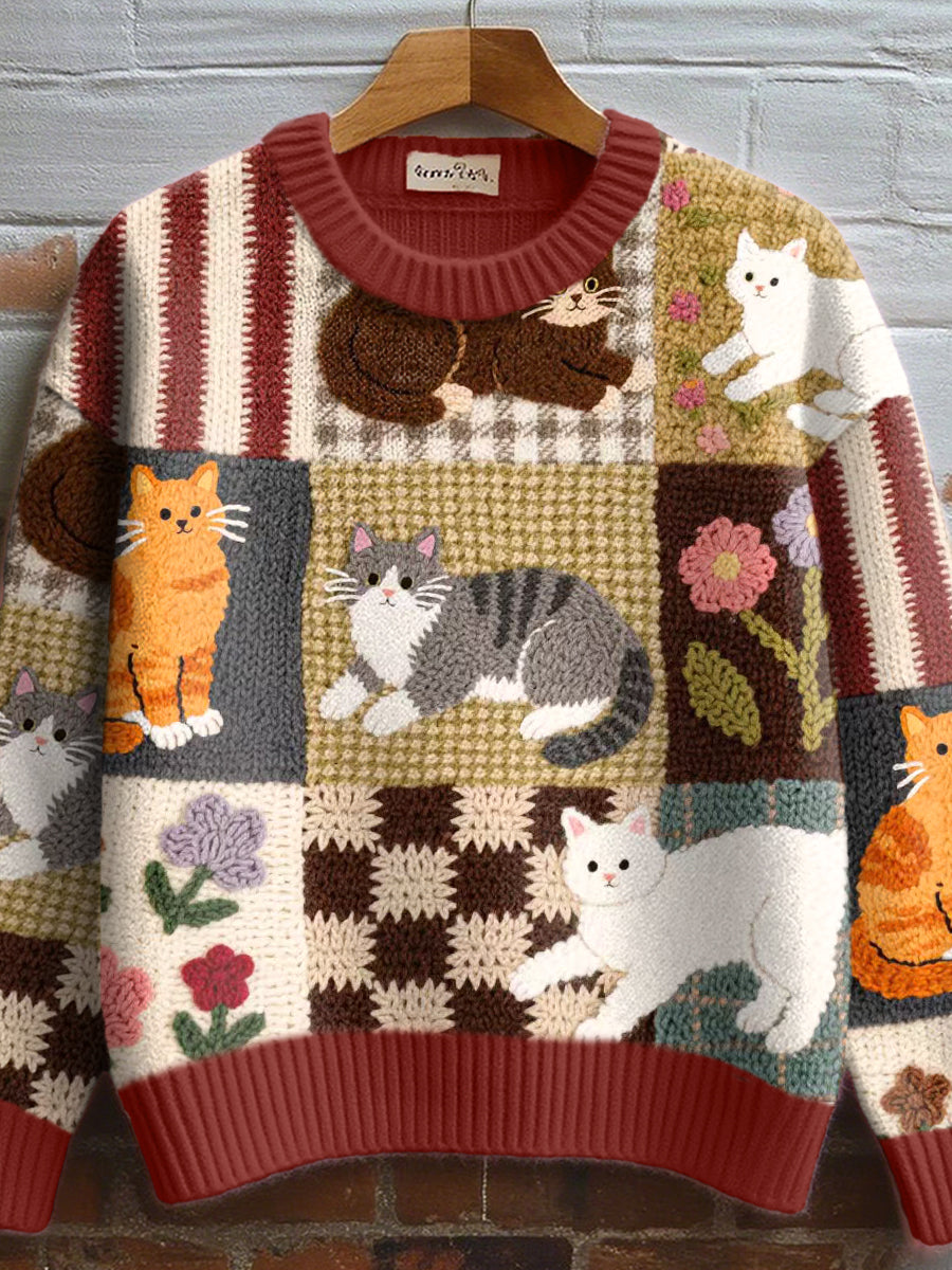 Women's Fall Floral Cat Crochet Pattern Cozy Knit Sweater