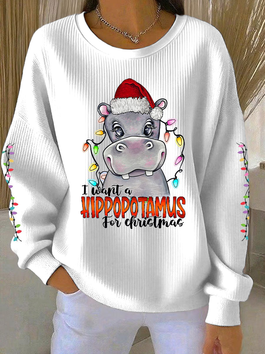 Women's I Want A Hippopotamus For Christmas Print Ribbed Round-Neck Sweatshirt