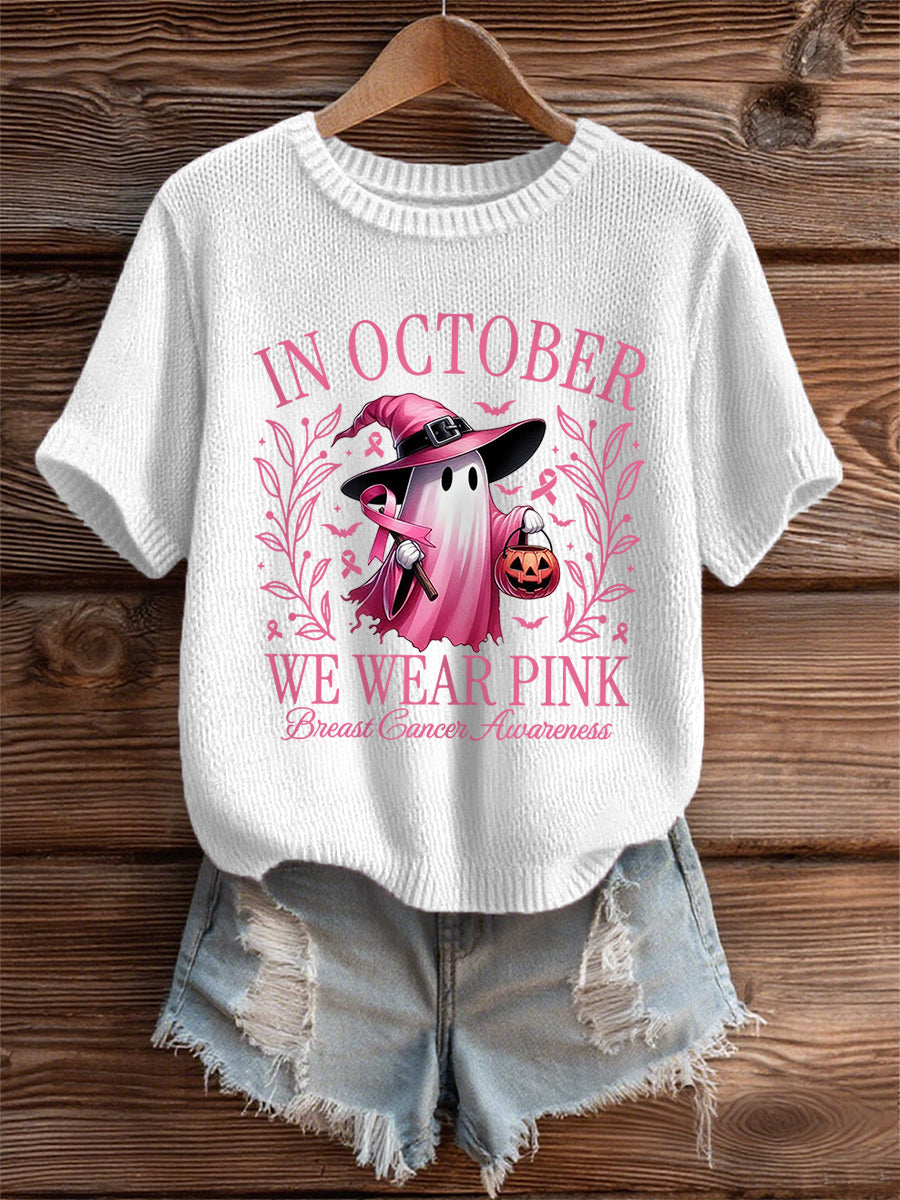 Women's In October We Wear Pink,Pink Halloween Ghost Print Breast Cancer Awareness Tee