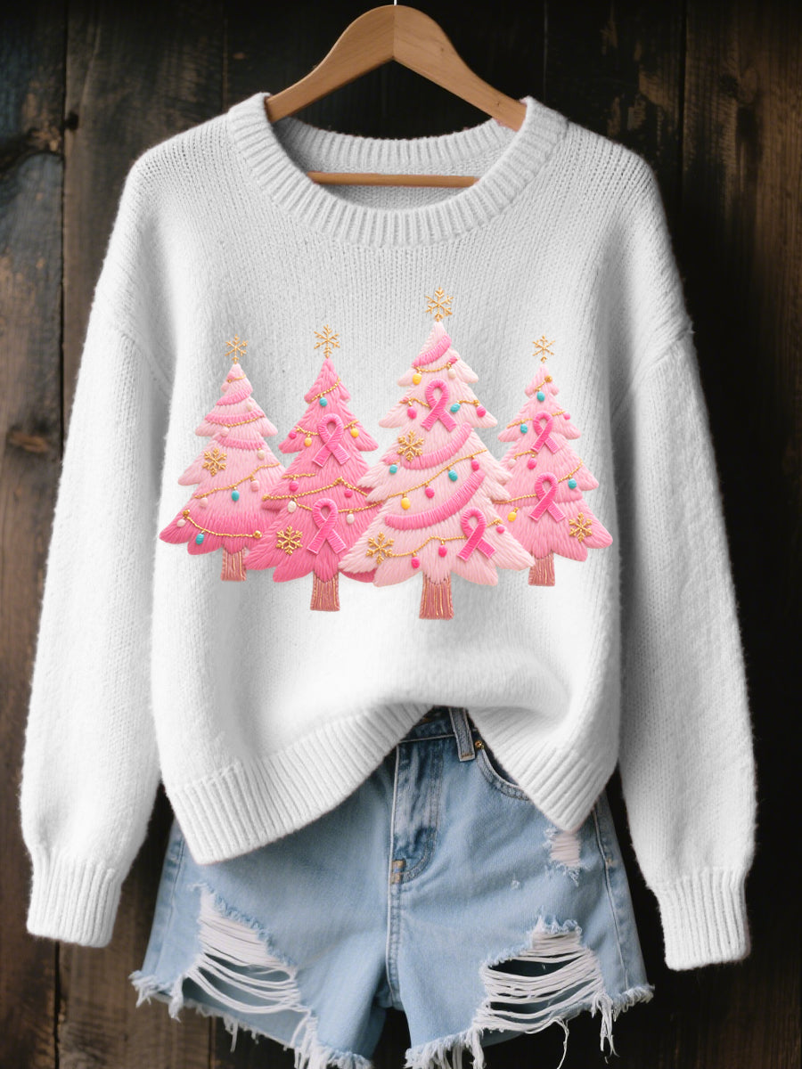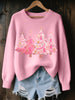Women's Pink Christmas Tree Embroidered Cozy Knit Sweater