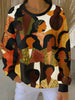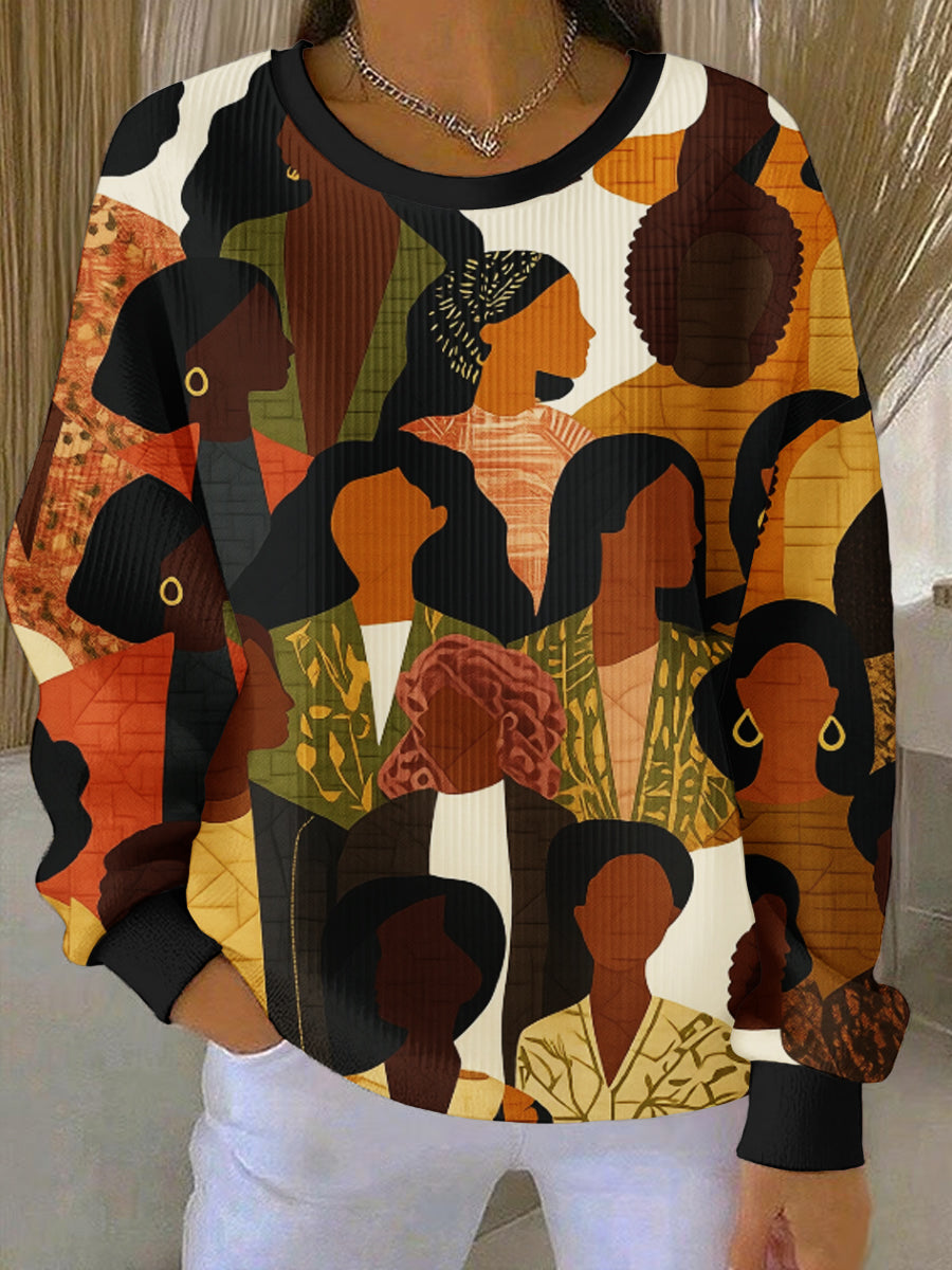 Women's Winter Black Print Ribbed Round-Neck Sweatshirt